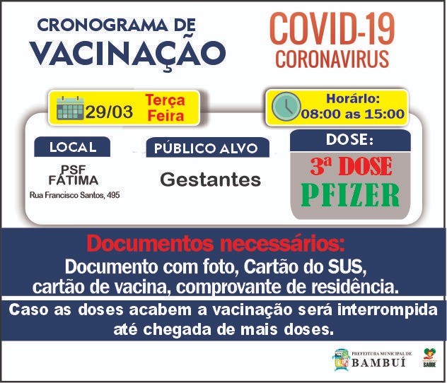 Bambuí terá mais um dia de vacinação contra a Covid-19 nesta terça-feira, dia 29 de março. A vacinação será na UBS Fátima.