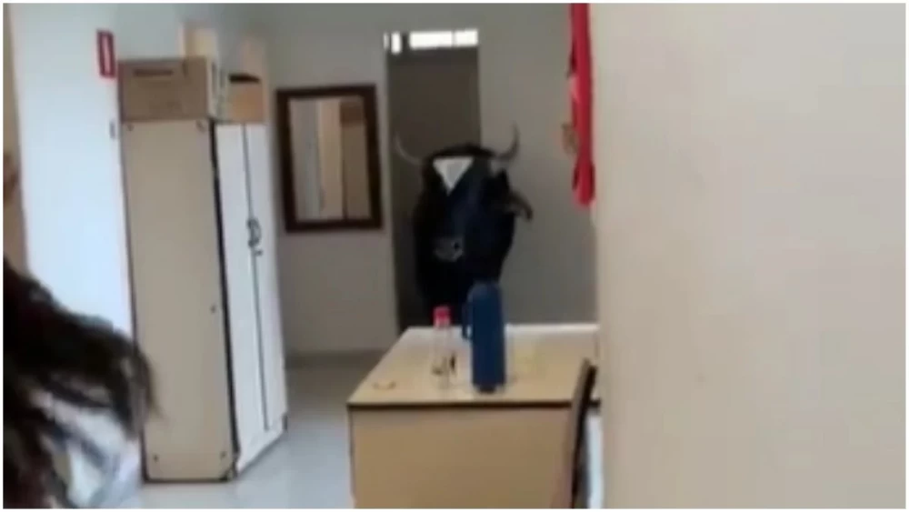 Na gravação, uma mulher destaca que o bovino estava nervoso. Ele defecou e fez xixi no chão enquanto o grupo tentava tirá-lo da unidade.